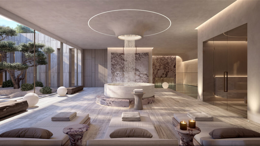 Wellness is a fundamental component of the project, embedded at the heart of the house rather than treated as an addition. The program includes traditional features such as a sauna, hammam, and heated indoor pool, alongside advanced longevity-oriented technologies, including cryotherapy and a hyperbaric chamber—transforming self-care into a daily ritual.