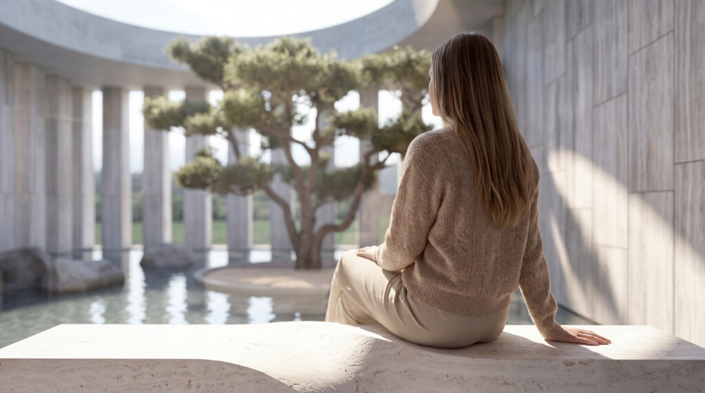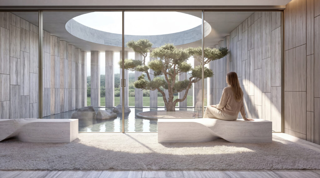 The architecture operates as an invisible infrastructure for wellbeing. Natural light regulates circadian rhythms, air circulation supports physical vitality, and spatial sequences are designed to promote rest, recovery, and introspection. In this sense, the project moves beyond functionality, positioning architecture as an active agent in human health.