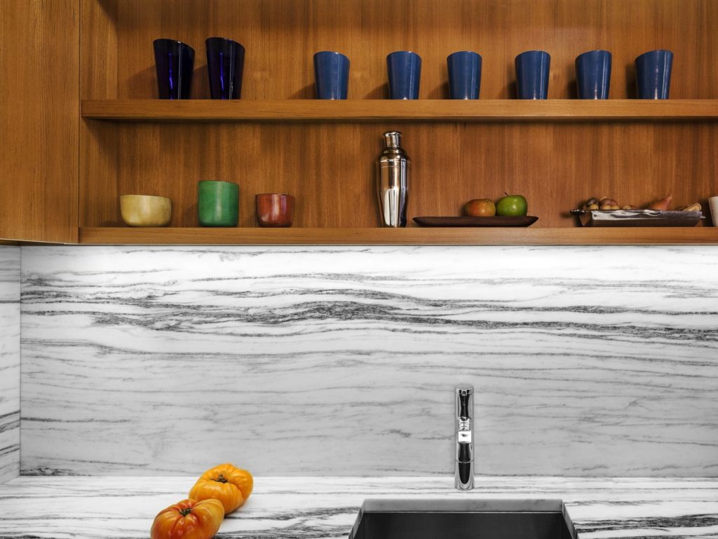 We had the stone counter and backsplash cut from the same slab of Vermont marble, achieving a continuous graphic pattern.