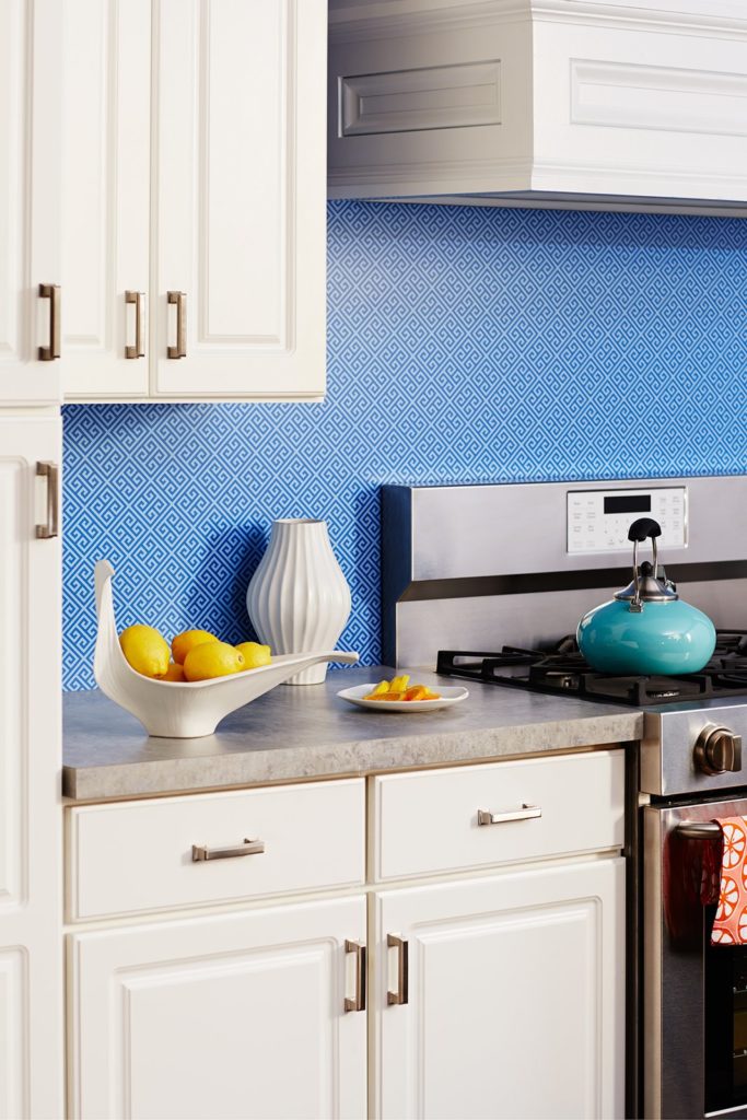 Think beyond tiles – wallpaper your backsplash instead! Coated with Teflon, this geometric-print linen wipes clean.