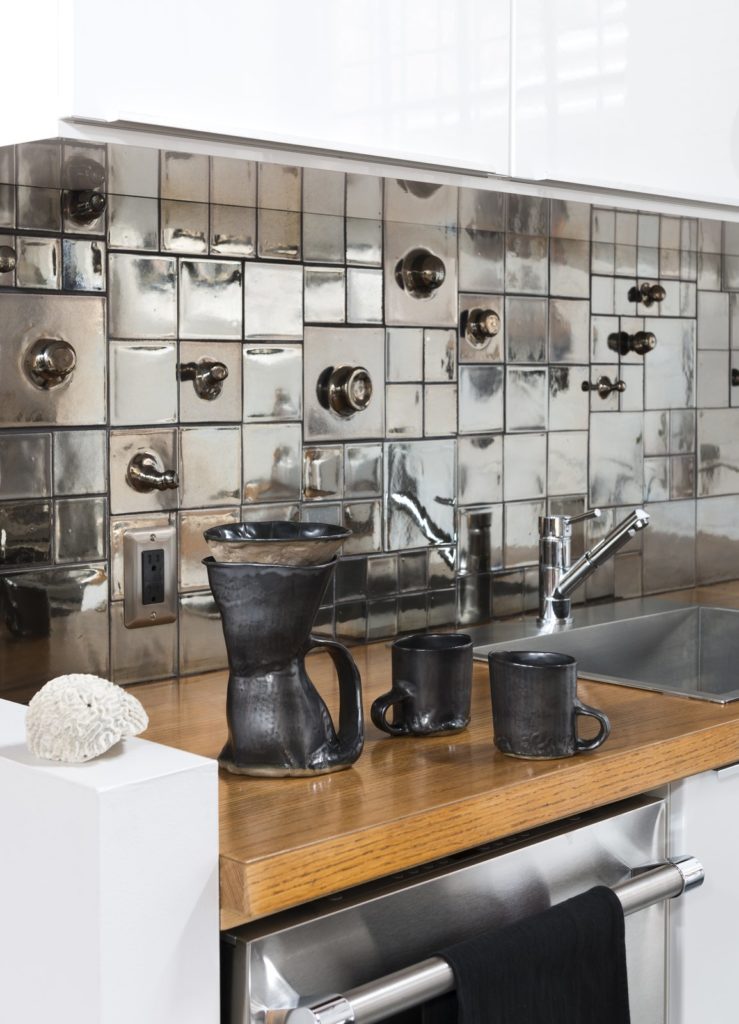 In the kitchen, copper-colored stainless steel tiles from tile bar create a glowing backsplash. The cabinetry is by IKEA, the countertop is Caesar stone, and the induction cook-top is by Bosch.