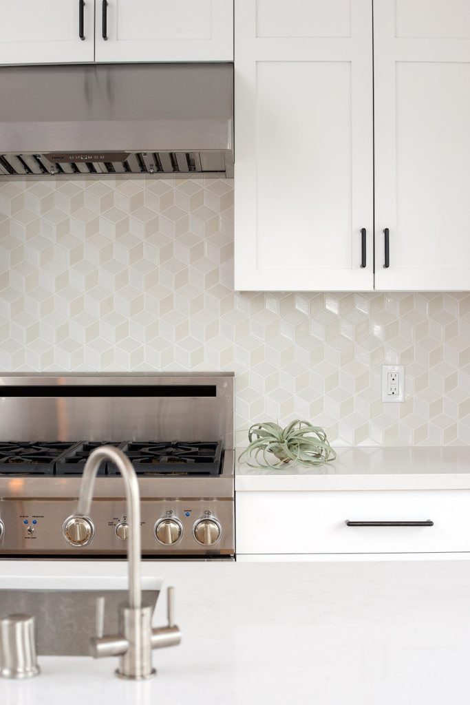 Fresh white kitchen with warm wood wrapped island, black cabinet pulls and cubic patterns heath tile backsplash.