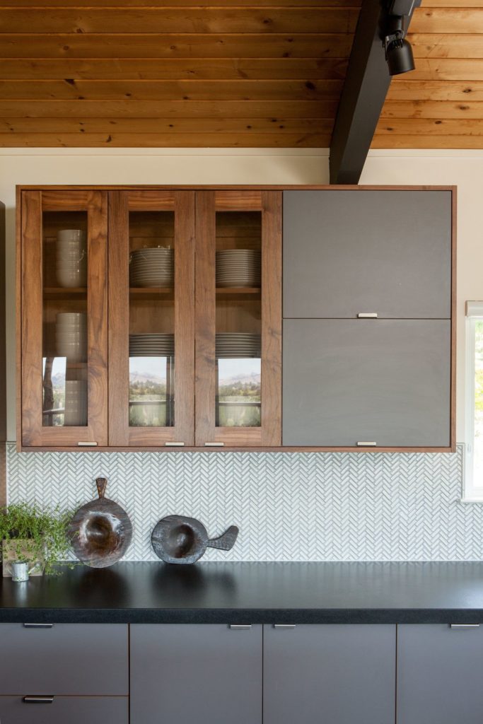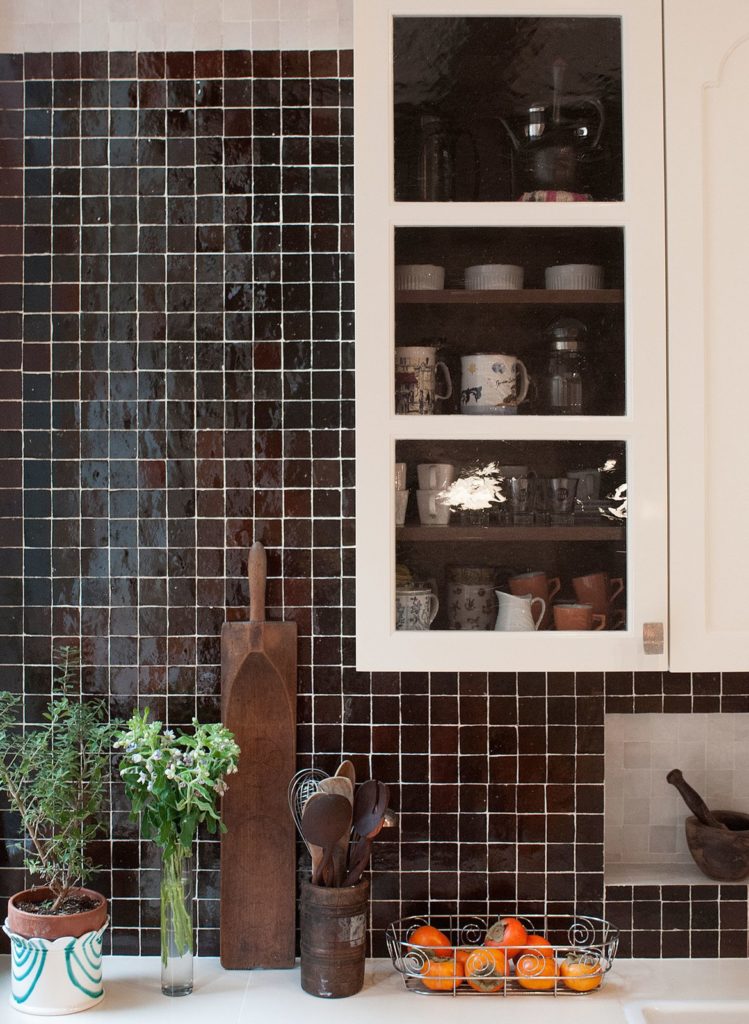 Hand-made Moroccan tile backsplash comes from a mosaic house with the contrasting niche. Custom kitchen cabinets designed by Miriam biolek interior design with bendheim’s mouth-blown glass inserts.