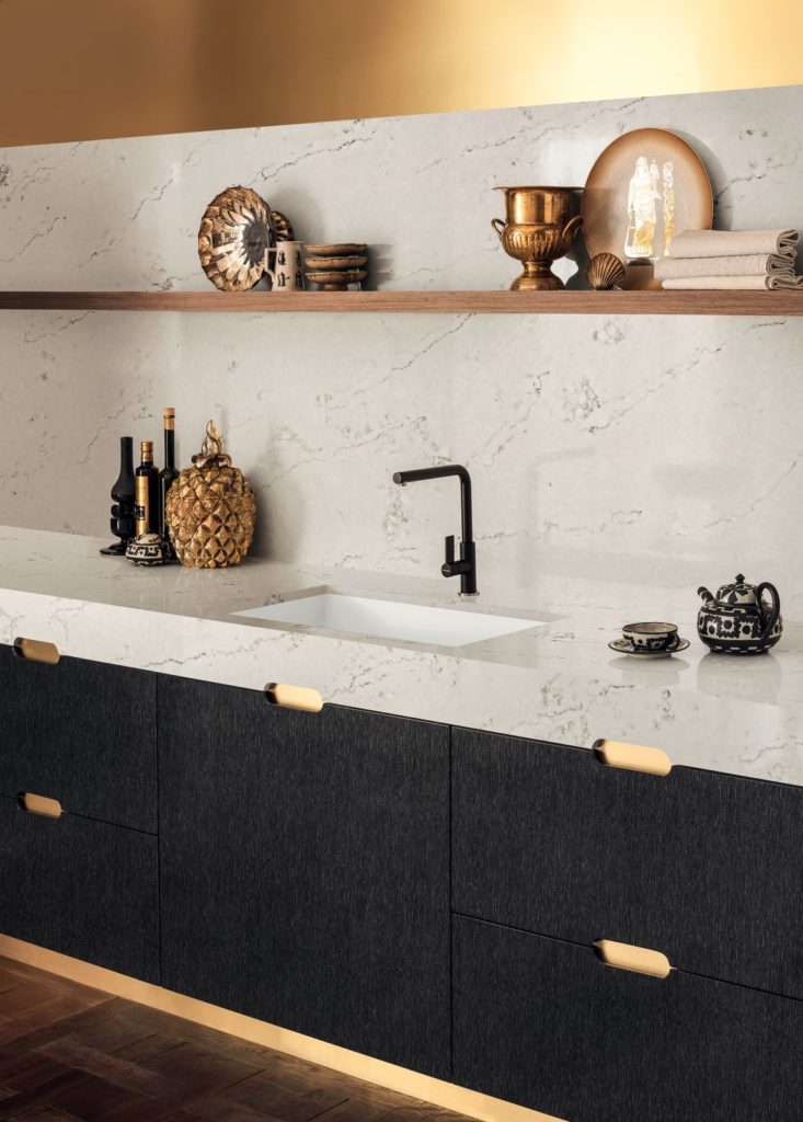 Countertop wraps the wall behind it to become the backsplash, providing a polished backdrop for design details and vignettes. Its muted color complements dark wood cabinets and rich, metallic accents.